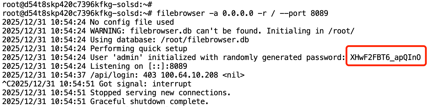 📢 这里的密码不是 ssh 实例密码,可按需求自行配置。 🔐 由于 filebrowser 是直接暴露到公网,建议配置较为复杂的密码。